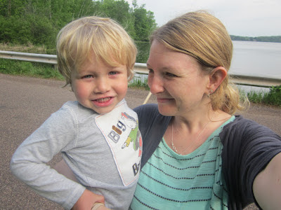 Gus and I went for a walk early Sunday morning, down to the "waterfall" (tiny dam) and bridge. He walked soooooo slowly, I had to keep saying to myself, "enjoy the moment, you're not in a hurry, the whole point of this is to pass time while everyone without toddlers and babies are still sleeping away in the cabin." Why am I always in a hurry? To do what? NOTHING.